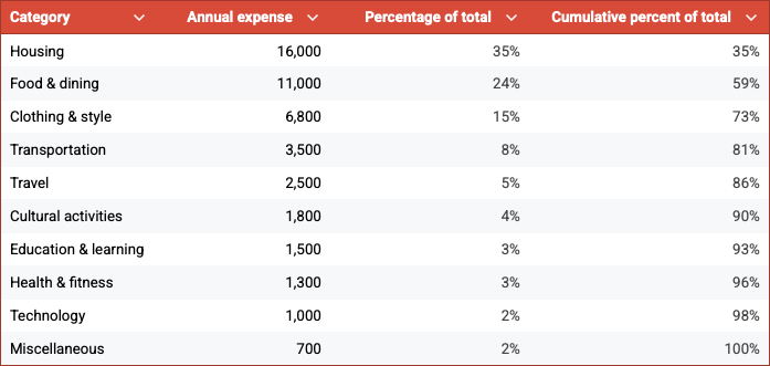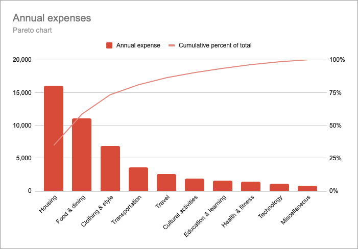 The table makes visible what the monthly bank statement usually obscures. A person may be preoccupied with finding a cheaper mobile phone plan, only to see from the table that the entire mobile expense is a minor line item—and that a modest reduction in a far larger category, such as clothing, would outweigh any possible saving on the phone. The preoccupation had been with the useful many; the opportunity was in the vital few all along.